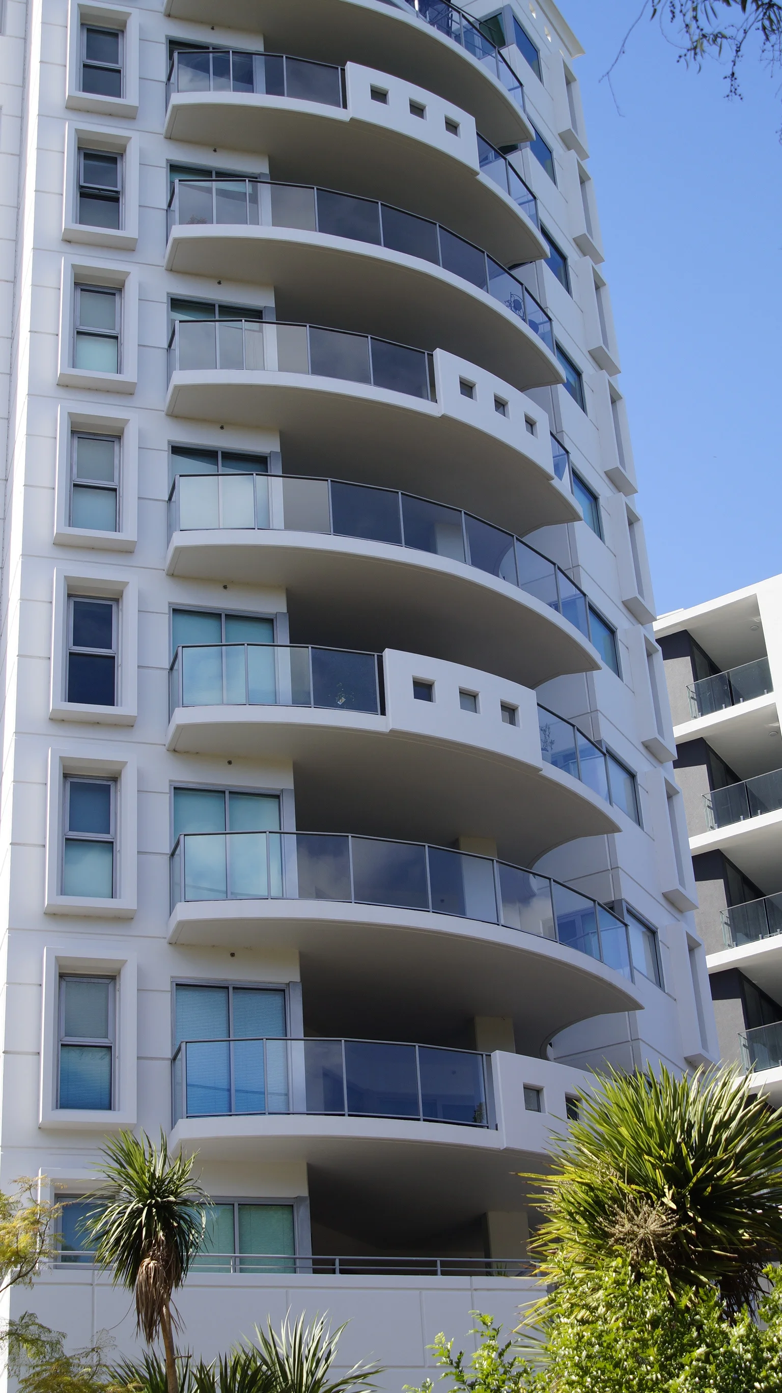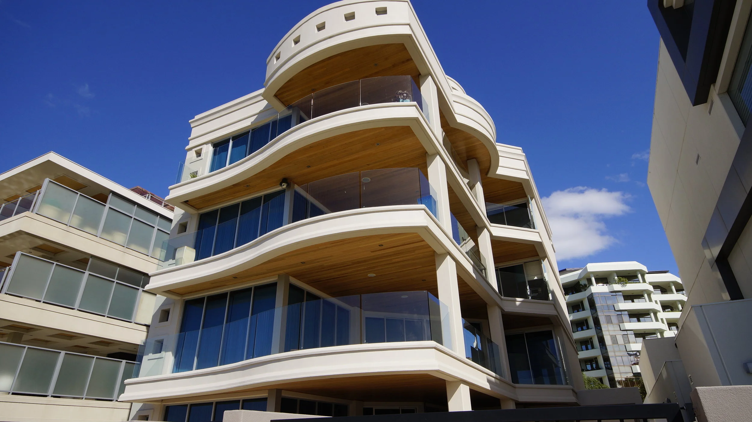 Luxury living apartments on the South Perth foreshore overlooking the city of Perth. Meticulously designed to take advantage of the views. Sand render, blue glass and curved terraces reflect the sweeping river foreshore.